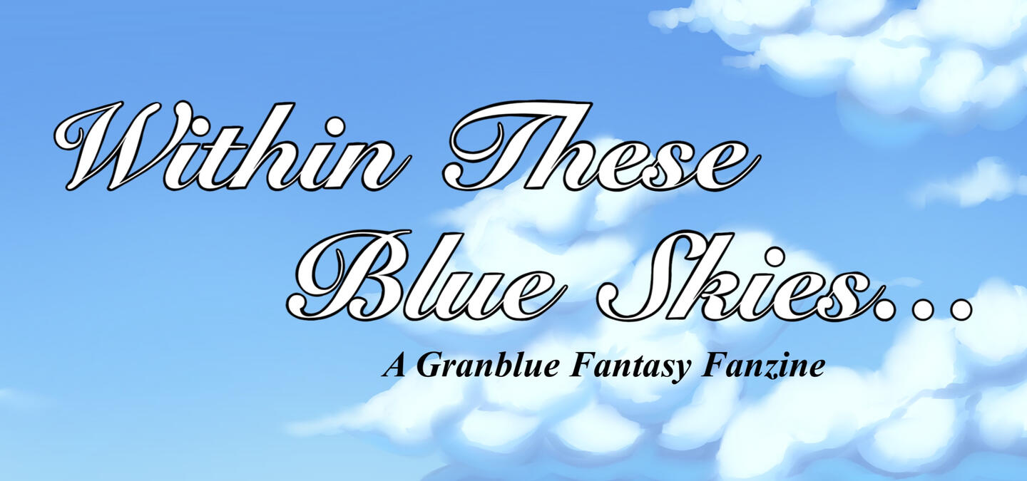 Within These Blue Skies... is an unofficial free and digital-only Granblue Fantasy fanzine. The theme is the focus on the daily lives of those amongst the Grandcypher crew and beyond! The quiet days spent in between battles and world ending missions that the captain and the others find themselves caught up in throughout their journey.